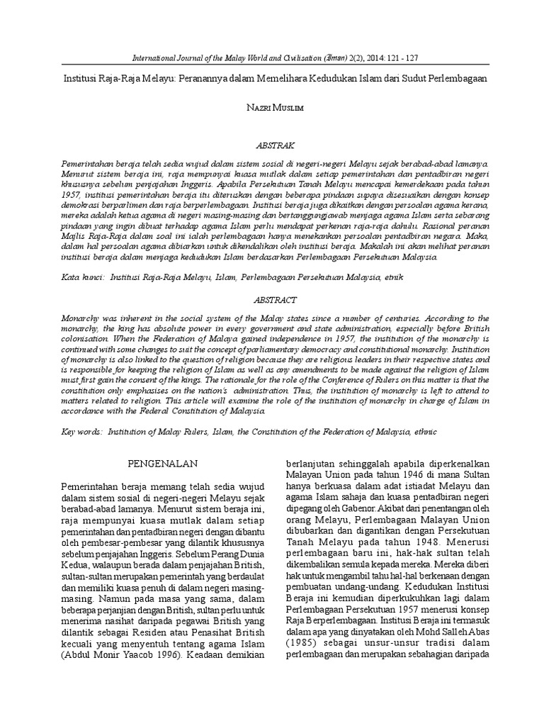 Institusi Raja Raja Melayu Peranannya Dalam Memelihara Kedudukan Islam Dari Sudut Perlembagaan Ukm Journal Article Repository