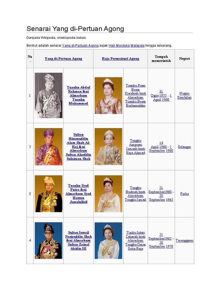 Yang Di Pertuan Agong Raja Permaisuri Agong Berikut Adalah Senarai Sejak Hingga Sekarang